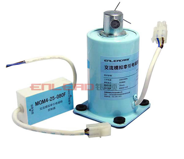 電磁鐵控制器裝在電磁鐵外部,電磁鐵的工作過程全部通過控制器來實(shí)現(xiàn)??刂破鞯妮斎刖€與用戶控制設(shè)備相連,輸出線通過四芯專用插頭與電磁鐵相連。